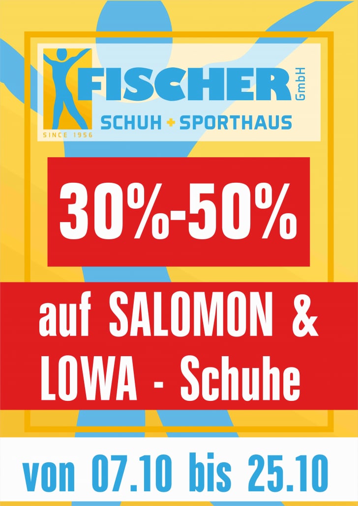 Vom 07.10.2025 bis 25.10.2025 erhalten Sie in unserem Sporthaus Fischer in Fichtelberg / Neubau bis zu 50% auf LOWA Und Salomon.
